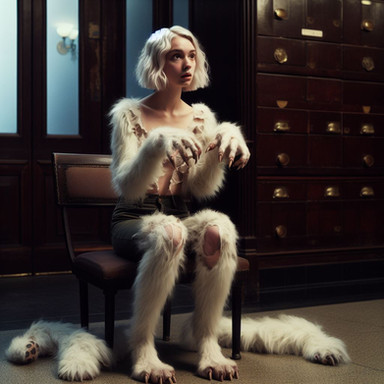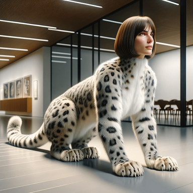 While Susan rested comfortably inside the observation room, hooked up to various monitors tracking vital signs, changes slowly manifested in her appearance. Initially, her hair lengthened gradually, then thickened into a luxurious coat of fur matching that of a typical house cat. By the time Linda intervened, Susan's physique transformed entirely into that of a snow leopard. The magnificent animal regarded everyone with curiosity through crystal blue eyes before bounding off its bed, surprising everyone present.