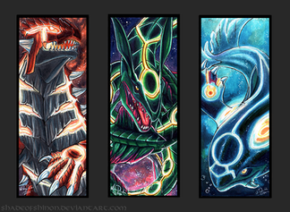 These were basically the only things I completed over the course of the summer.I was really busy and didn't have much time for drawing, but I did these little guys and they were probably my favorite project of the year so far. I choose my favorite legends from every region( I started in 4th gen, hence why there are 2 Sinnoh legends. /I couldn't choose/). I also have one for Mew, but my scanner wasn't big enough for seven, and as it's my least favorite of the bunch, it got left off x'D