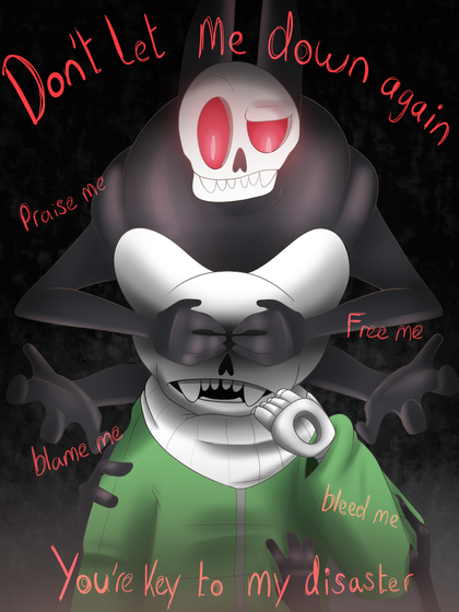 doomatter sans is couching out blood and the black staff as will, when ever he hears his demon talking to him that mean he has to stay way from anyone that his close to him and lock himself in his room so he won't let that thing hurt his love like it did to his parents. the demon "scar" its getting stronger, doomatter sans is scared and afraid of it. he has to do this every few moths, remembered the black marks on his finger tips, when the mark up to doomatter arms...run, doomatter sans is in so much pain that he is shacking.Related content