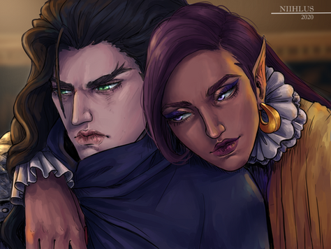 I have finished this piece as a commission for the wonderful astralfox0893 I have begun to work on a new style last month, finishing several pieces in a more painterly way that I felt helped me preserve brushwork and keep me away from overpolishing too much. I have also opted for some strong lighting conditions here, in an attempt to evoke a bit of light vs. dark split in both the artwork and the characters. The commissioner was kind enough to let me use the new style for this artwork, and hopefully it worked out well! I hope you like the final piece.