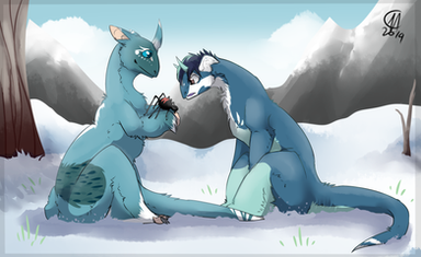 The picture is awesome! I love how you draw the poses and expressions. together with the background it makes beautiful scene. Thank you so much for you work on this GaelicKitsune <3 and thank you again, Bluehasia for the gorgeous gift!