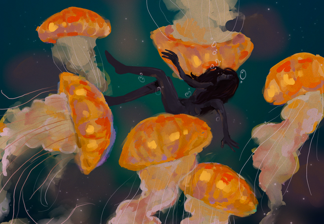 Nuh, the jellyfish were supposed to be the main thing, but I accidentally drew attention from them by going detail-crazy and adding stars and moon and waves and all that...