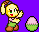 A penguin-like creature wearing a yellow kimono, a red-and-yellow sash, a red robe with white trim, and a red toboggan cap with a white tip and a gold rim carries his hammer around...