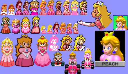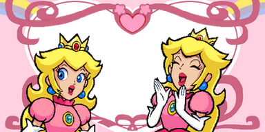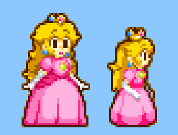 Original Sprites by Nintendo, AlphaDream, and .Peach has just used a Double Cherry, and since the real princess (the one on the left)Β is one step ahead of Princess Daisy, she's telling her clone (the one on the right)Β that she needs to go take a trip somewhere across the kingdom (but it seems that Daisy's unpredictable, since the Peach clone is practically clueless compared to the real deal).