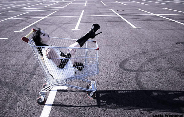 update: to avoid misunderstanding ->life is like a compulsive buying. The compulsive buying, symbolized by the shopping cart brings us time and (time) again to those places where a sunbeam more matters than articles of clothing from gucci, armani, etc. Hence the saying -> "life is like a compulsive buying, problem is that we buy most of the time the wrong things" In this moment, the person makes the right choice, she choose the light, an elementary requirement -> silence, safety and warmth. The person on the photo isn't the ware, she's the consumer in a life time compulsive buying.