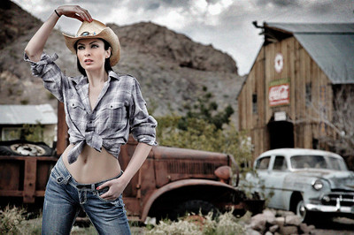 The girl kinda reminds me of Snow White. Perhaps, you could have her stand in a green background, taking a bite out of the apple with bright red lipstick on her lips, lots of eyeliner and a knife behind her back (or a pigs heart)...Also, the dress could be a nice red color. The knife could have blood to tie it in. Just an idea.