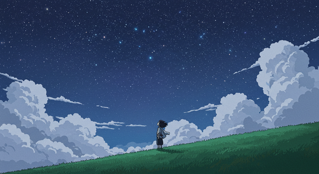 The cascading level of detail is also very nice; bringing attention to the foreground, while having nice details in the background. The level of texture captures the eye very quickly. The form of the person, squirrels, branches, leaves, and birds are also well done for the style.