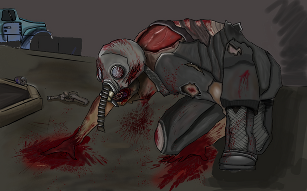 My OC is a Pyro infected with the hunter strain. The noises he makes are gurgling, hissing, clicking, muffled screeching, choking, and screaming.took maybe 5 hours to make. the tree is my favorite part . If the colours are slightly off it's because i had to use my moms vary vary cruddy computer. The suit is supposed to be dark gray and the gloves a yellowish beige.