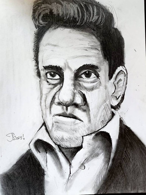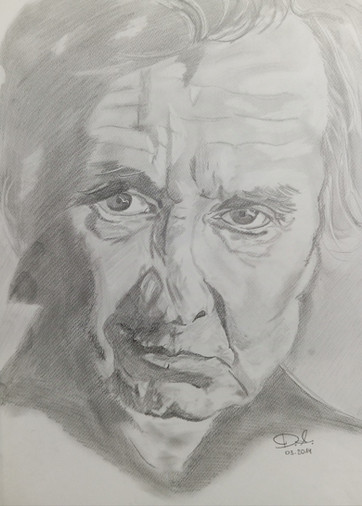 Cool! I like the close cropped composition that brings the viewer in. Your style of mark making adds a lot of life and energy to the piece. Your proportions look pretty close. You did a really good job of capturing his likeness and gave him a great countenance to his face. You have a really good range of values. My only gripe is that the values for his eyes, brows and mouth look a bit too dark. But it's a great piece of work!