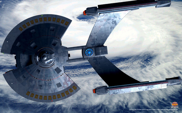 The starship Excelsior orbits the planet Risa..rendered in Celestia,'Risa' pack 'downloaded from The Celestia Motherlode ([link] ),'tweaked in psp X2 by me!!