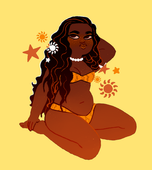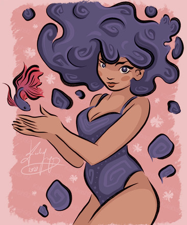 Aww! Poor stolen bathing suit At least it got a pretty tribute! I remember seeing the sketch of this. This may sound weird but I just LOVE the little dangly fish! And I love that they stayed in the final image and you colored them. They're such a cute little detail for the piece! Outside of the lil fishies I really like the colors you chose; the sky and water are both blue but still easily separated, and of course, all the lovely reflections in her hair give it fantastic depth and a hint of shine