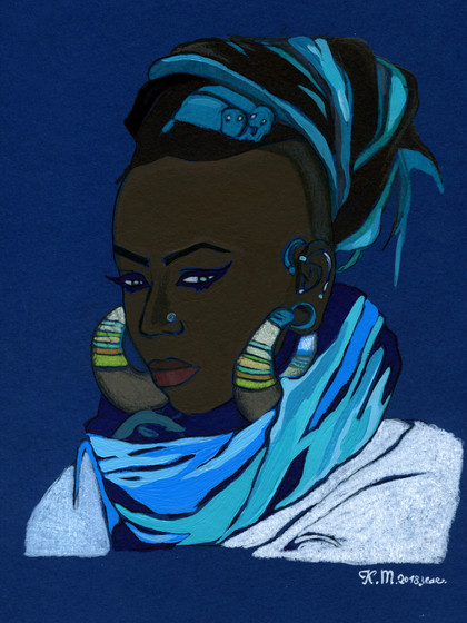 You managed to draw neat dreadlocks. Not only do they look perfect, but the way you have them pulled up to a bun gives the design a better organized feeling. Β The addition of the jewelry in the hair addds just the right amount of flavor to connect the blues of the hair wit the orange of ornamental.