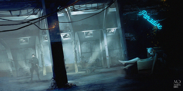 Bardzo neonowe i magiczne, przypomina mi światła nocnych miast. Cały ten klimat, tylko że tutaj nie ma zgiełku i pośpiechu. Wszystko zdaje się płynąć powoli i spokojnie. A z wodą to się kojarzy, oj tak Nie tylko ciemny błękit, ale też rozprysk drobinek. Twarz kobiety w tej zieleni, radioaktywnej niemal, przyciąga wzrok. To już jakby nie manipulacja a twoje własne dzieło, gdzie czuć tylko twój pomysł i historię. Czarodziejka