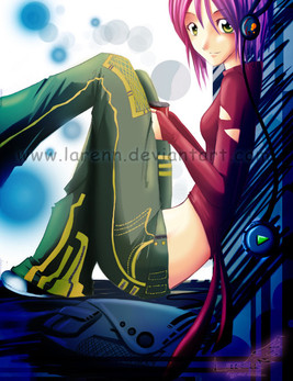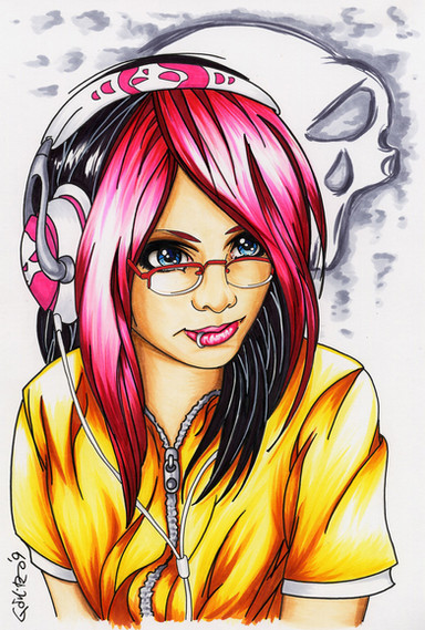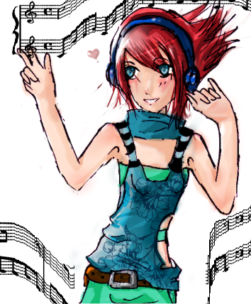 The compostion is really nice, the colours stand out so vibrantly! I'm really enjoying the bit of green in the shadow of her blue shirt too, it compliments the pink in her hair and the empty space between the musical notes and the cord of the headphones is well placed it's empty but doesn't give off the feel of emptyness ^__^ Very well done