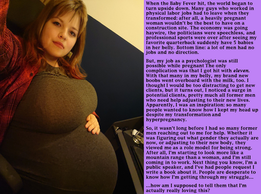 Reaching the half-way point of the video, Larry was still oblivious to her transformation, even as her stomach gurgled softly before abruptly bulging outwards. Steadily inflating bigger from a small muffin top into a round, almost pregnant looking dome, and yet it kept getting bigger and rounder. The shirt tightened around her belly, leaving less and less to the imagination about what her stomach looked like, underneath. Soon, however, it went from a nine-month pregnant belly into an overinflated beachball. Eventually, though, she finally noticed her expanding belly as the top of it rose into view, entering her field of vision. She looked down, only for her eyes to widen, and jaw to drop at the sight that greeted her. “What the hell?!” she exclaimed, thrusting her arms out beside her. “My belly is huge and-…and I’m a woman?!” she exclaimed, only to hear how feminine her voice was. A far cry from what it had been moments ago. Bringing her hands to her face, she touched her face, to which her eyes widened, and jaw dropped at feeling how soft and smooth it was. “Holy shit, I am a woman, and-…so big,” she trailed off, tone softening, though, still a little nervous as she looked down towards the big round belly in front of her. The same belly that her shirt was currently hugging tightly, framing in such a way that it left very little to the imagination about its shape and size. She stared at her inflated belly, until she reached down and grabbed the bulbous mound, gently squeezing it. All that did, however, was just cause a thought, she never expected, to pop into her head.