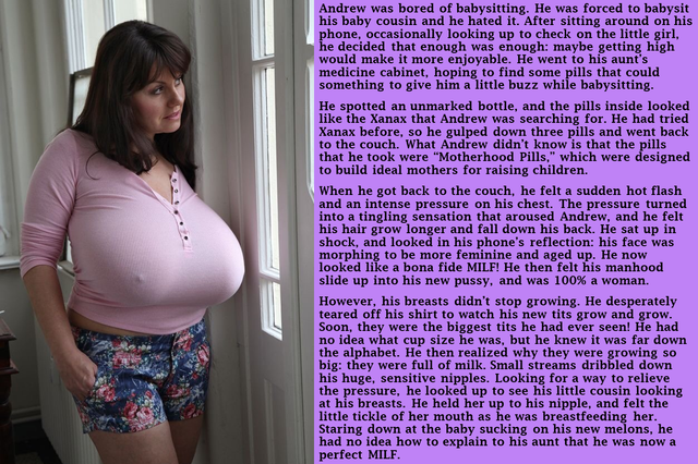 “Yeah, I’m not kidding. I’m no longer fat and my tits are huge,” Ben said, sitting on the couch with her friend, Jake, on the phone, her friend’s shocked response blaring on the other end which made her giggle, humored by his jealous tone. She giggled again as Jake asked the one obvious question that she was waiting for. “No, I don’t know how it works. Remember, I got ill and then just suddenly turned into this, well, first I got really fat but now I’m like really busty. Like, I thought your sister’s boobs were big, but these put your sister’s to shame. Sorry,” she apologized after bringing her friend’s sister into all of this. “Aaanyway, get your fat ass on down here and I’ll give you something to be really proud of,” she said, before hanging up the call, stuffing the phone into her bra. The breast spot for someone to keep their phone, although, that probably applies more to girls than it does to guys. Sighing happily, she smacked her arms down on her legs, staring down at her beautifully bulbous chest, her hands gravitating up towards the ample bosom, squeezing it in an arousing manner that made her bite her lip. Standing up from the couch, she walked over towards the nearby full-length mirror in the living room and smiled at her reflection as she began posing in it. Bending forward, her big breasts drooped downwards, resembling large pendulums as she gripped the bloated globes. Standing back up, she turned around, bending forwards slightly as she presented her ass to the mirror, shaking it, giggling as her soft backside jiggled. “Damn, and I thought I was big before with that belly, but I honestly prefer the big boobs over being fat, or, hell, even just pregnant.” Sitting there on the couch, Ben froze, her smile deteriorating slightly. “Yeeeah, now that I’m hearing that out loud it does seem pretty ridiculous to think that I was actually getting pregnant rather than just plain fat,” she thought aloud. “Still, I look forward to taking these moneymakers out for a test run, after I’ve…done whatever the it was that did this to me in the first place to Jake. Get him started on his own path to womanhood.” Her smile returned, spreading from ear-to-ear as she groped her boobs. “Man, it’s a good thing my sister is so lazy with leaving her clothes over here whenever she’s by, otherwise I’d probably have to meet Jake wearing nothing but my biggest shirt. Fortunately, I had some skirts and one of my sis’s sweaters, so that will not be happening.”