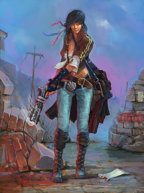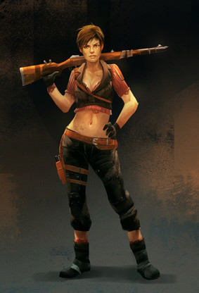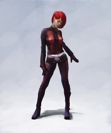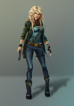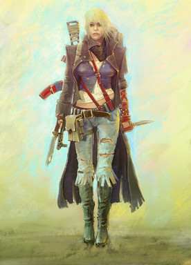 great pose! and so much character, I think the green pockets on her leg and arm are too similar in size at this point, what I mean is why would they have similar sizes if one is meant to be at her arm and the other not so easily in reach? I feel like if she had a specific tool she stored in one of the bags it would help you justify why they should have more variety in shape and form. Good job