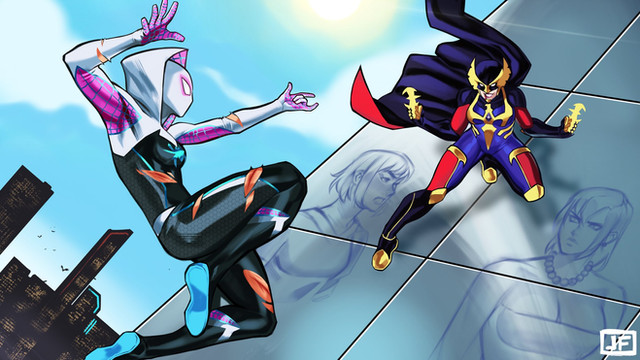 Just wanted to go for the flats today (especially after the classic goof of putting the inks on the sketch layer, grr...)Gwen and Gwen mixup their costumes somehow. Ms. Stacy doesn't seem entirely prepared...