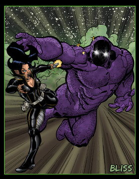 Depravity wasn't about to allow Venom to go free. Even with the generous act of saving Gwen's life, Venom had taken far more life than could ever be balanced with saving just one individual. Just as the symbiote was settling back onto Rebecca's body, Depravity unleashed her whips and lassoed the inky-blob of a monster. Rebecca cried and pleaded for the symbiote to be returned to her, but that wasn't to be.ΒThe Guyver eyed the exposed possessive alien. She began warming up her head beam once more...