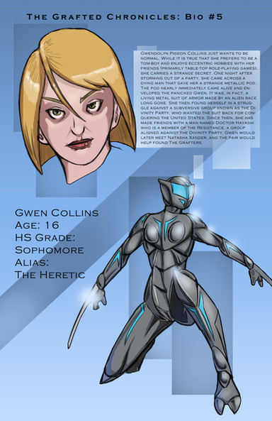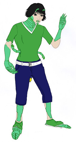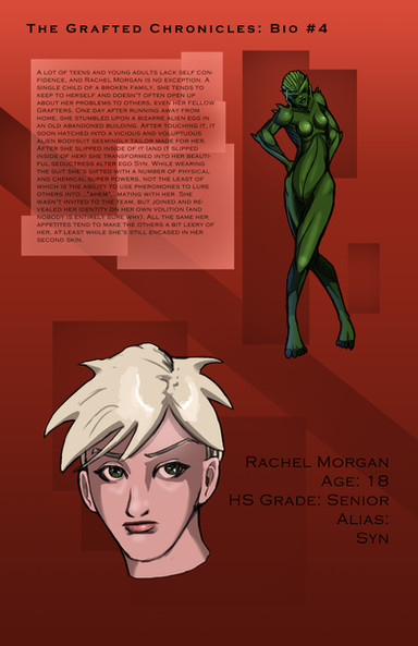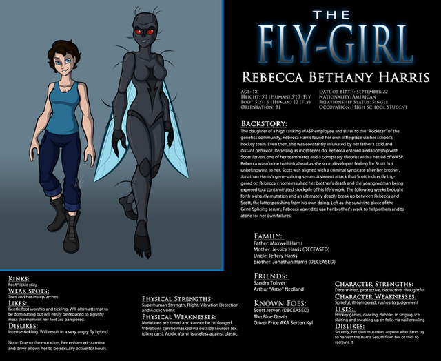 There are five heroines total in a joint series titled 'The Grafters'. Each of the heroes gains their abilities through living suits known as 'second skins'. I'll be making a bio for each of the Grafters as time permits.This one belongs to AraghenXD Β , and is known to his followers as Fly-Girl. This version of her is not the mutated-fly like in the canon version of Fly-Girl. This one wears a living suit that envelopes her and gives her the abilities (and habits) of a fly. Each of the OCs in this series has various modifications from the originals.