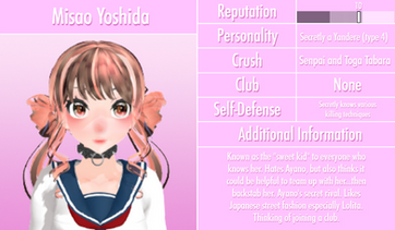 Relationship with Yan-Chan: Kinda-of friends with her. She doesn't snitch on her, so Yan-Chan trusts her. They talk to each other at lunch on some days and Yandere-Chan asks her anything she need answers to.