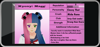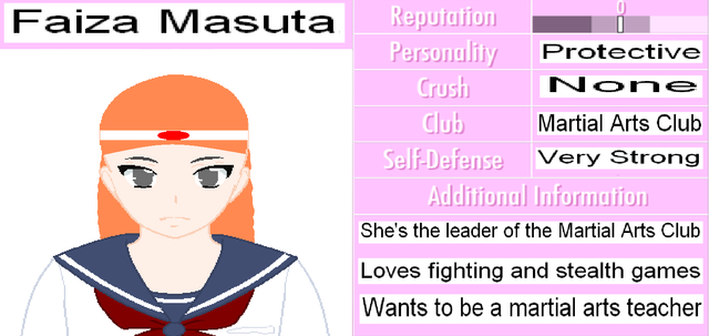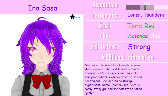 Class: 2-1 (took out where she sits because of the current sitting places YandereDev put in with the new students)