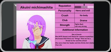 Ethnicity: Half Japanese, half American (Mom:American, Dad: Japanese) (Her Mom knew how to speak Japanese, for she took classes when she was little. She joined the Occult Club when she arrived to Akademi High in 1989. She was a 2nd year with Yandere's mom.) (Her dad was a delinquent when he was in school in 1989. He was a 3rd year with Yandere's dad (I think))