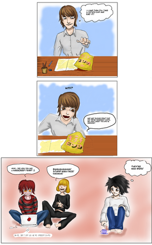 Mello takes a bite out of some chocolate he finds from Near's stuff. Unfortunately, it's plastic.For the first time I wasn't lazy to work on this with pencils only. I actually had time to ink and color this. Hurrah.