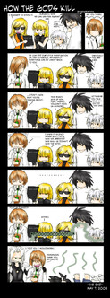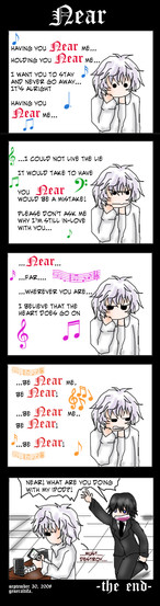 A real L was supposed to be in the last panel eating a plastic scone and suffering the same fate as Mello. However, I realized that he won't fit in there anymore because he's too tall. The solution? I turned him into a doll. The result? It's like Near is having his own pretend-tea party with L.