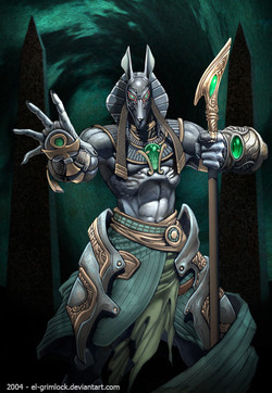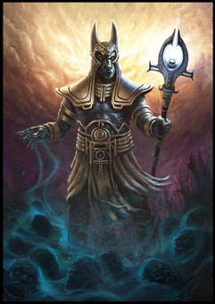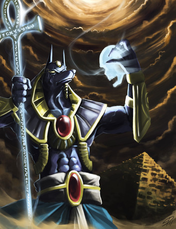 Anubis, the god of the afterlife in Egyptian mythology, lord of the deadlands and master of mummification. i like this guy his myth was my favorit one of the i was a kid and i read about egypt.a draw for myths & Legends TCG