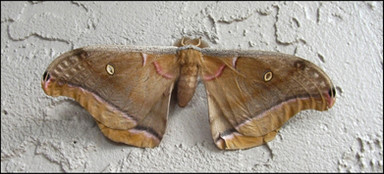 Polyphemus Moth is one of our biggest moths, growing up to a 5 1/2 inch wingspan. [link] Properly Antheraea polyphemus, this giant of a moth is named after the legendary Cyclops of the same name from Homer's Odyssey. (Remember - the fierce one-eyed giant who lived in a cave and tended sheep and ate straying sailors?) These large moths are found in the Puget Sound area, though they are not terribly common; in fact, they're nearly extinct in areas with lots of street lights. When you only have a week to mate and lay your eggs, wasting time circling a light (and making a tempting banquet for bats) is not healthy! [link] and [link]