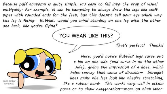 As for the height difference in the feet, that's an easy one to explain. Put a CD on a table, and look at it just above the surface, focusing on the points on the rim farthest left and farthest right. Now spin the disc* to the left (counter-clockwise). As it turns, the point on the left moves in and down, while the point on the right moves in and up. Now stand Bubbles on the CD, with her feet as the points on the rim. They'll move the same way. Even more so if you look at the disc from higher up.