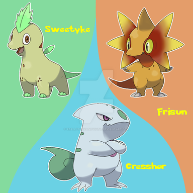 well, this is akward... I'm doing new starters because I don't like my original ones, and I actually have a feline (I know you change that one but still) and a shark-dog hybrid, but I wasn't copying you (in fack, if you see the designs in the future, you'll see that they dont look like yours)... it was a case of "great minds think alike" (although i wouldn't call myself a great mind)