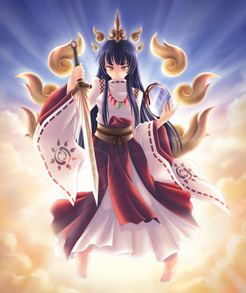 Yeah, I like to represent her with the three treasures of Japan. So behind her it's Kusanagi ! She also has the mirror and the magatamas.