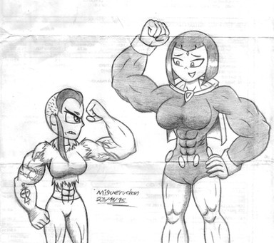 I love the hairstyles and expressions in this one . Awesome piece of art ! Also is the smaller one slightly more ripped ?