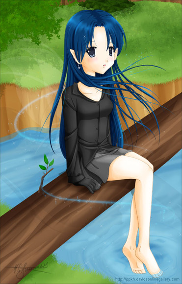 Absolutely everything about this picture compliments everything else. The way the colors flow so smoothly together... The grey tint of the rocks getting slightly reflected by the blue of the water, which sparkles ever so well... The trees int he back, helping set such a serene mood, helping your mind wander past the image itself... That single flower.. such a nice detail! Up to the girl.. her colors, the way she looks, it really pulls off not only the magical girl look, but also.. I'm not sure.. a natural, spirit-esque feel, as well as the 'normal girl' kind of look.