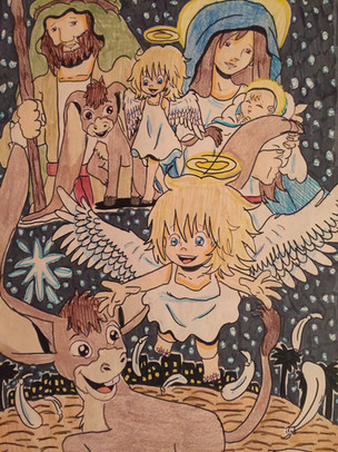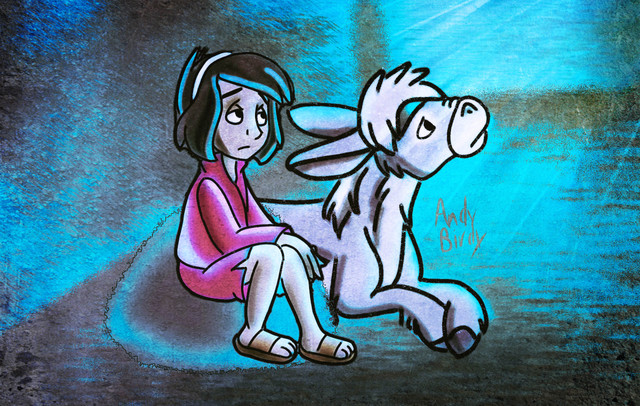 Here's The Small One, with Small One, a donkey, a boy, and the silhouettes of Mary and Joseph, at the town of Bethlehem, and the Star.The Small One (c) Disney / Don Bluth / Charles Tazewell