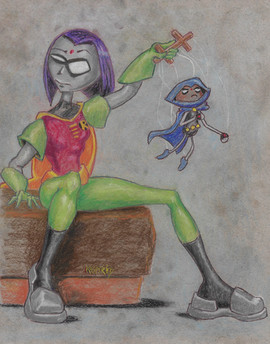 Starfire and Raven with some doggie puppets. The puppet is based on the one used by Juri in Digimon Tamers (another of my favorite shows). Now I realize how much Star and Rae resemble Juri and Ruki, they are very similar (one is very cheerful and the other is very serious).Well, hope you like the drawing.