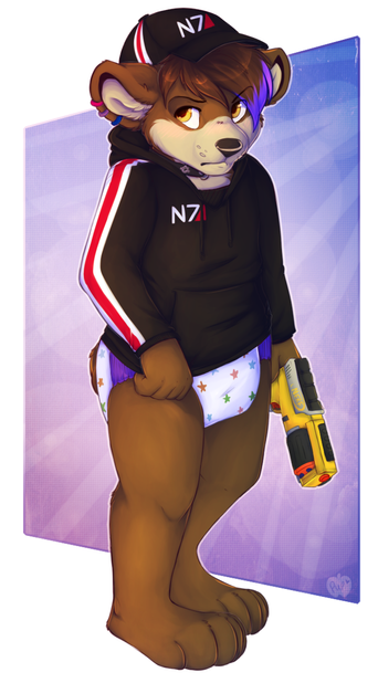 The little bear walked into the kitchen. Or maybe 'waddled' would be the better word for it, as he had insisted to get dressed into a comfy hoody with a Deus Ex Logo, a fitting basecap with the Transhumanism logo sewed on (not that he would knew what it meant) ... and the thickest nighttime diaper his parent's had available for him.