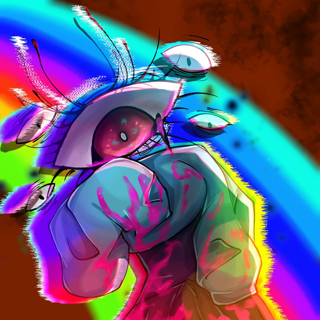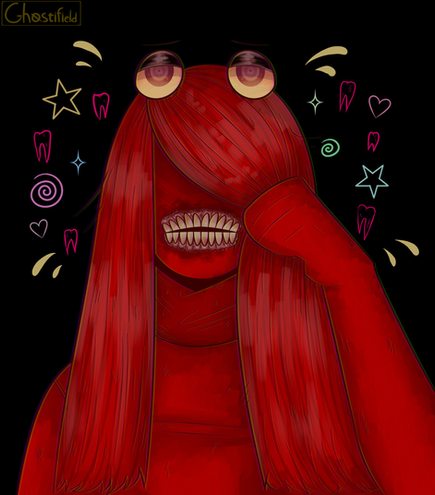 (Ref is unfinished sorry haha, first form, with 1st metal teeth option, wearing some simple square glasses, yellow to red gradient on the right eye's pupil(You can see those colors on the ref beside the mini icon thing))