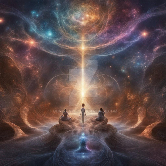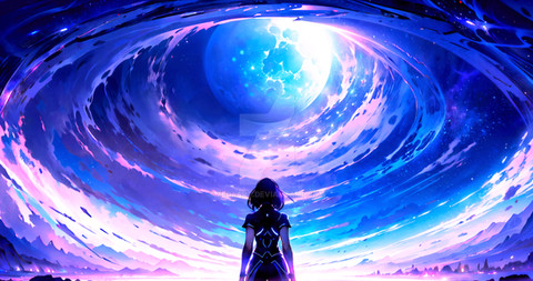 Started working on this image after waking up from a dream, a woman(?) entity or god like being has a deep longing for the unknown, to escape reality and experience the unknown. i dreamt of un-ending fractals and a seemingly infinite journey where a feint but also bright pure white dot lay in the ever far fractal.Started with text2image describing the dream and then worked on emphasizing features such as "fractals" "unreal physics" "beyond" and vague concepts that I felt would steer the picture to something at least close to the feeling. This has a lot of variations just picked the one that felt the most to me.