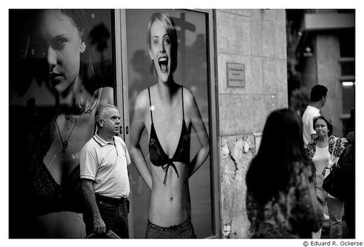 wow I fav'd this along time ago and I still think it's amazing and had to comment on it again. The way the bearded mans pose and hand to his face mirrors the man in the ad behind him. As if they are both looking at the underwear ad. Perfect moment! I can only imagine the thoughts in the bearded mans head. haha.