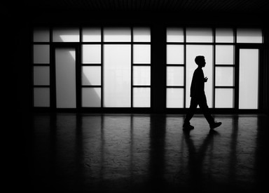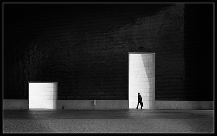 This is a picture I found very powerful in its treatment. The fish-eye effect creates a dual feeling of imprisonment and closeness: in this little world, it seems that nothing else can exist save what is represented in the picture, and there is no other way but to play this game until the end, until that last straight line is finally walked on. Moreover, all the closed doors around enforce that feeling. As for the black silhouette framed by the strong light, it indeed appears as some kind of ultimate goal to attain, both vulnerable and yet still strong enough to provide a worthy last stand.