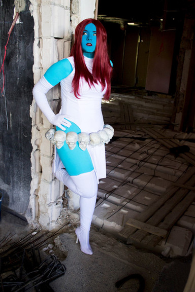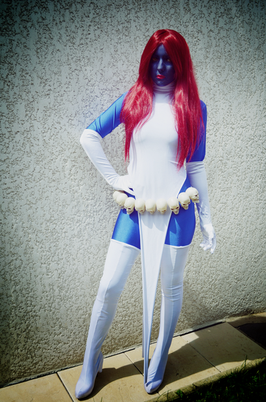 Mystique is made out of white matte spandex and blue tights, so I could avoid having to paint my arms and legs. My skull belt is resin casted and then painted a metallic gold. I also cut and style my wig.