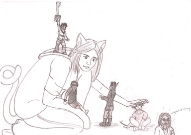 Aint they cute? Drawing by:Atrix on the left, Kikata in the middle, Prila on the right...humans in Kikata's hands.