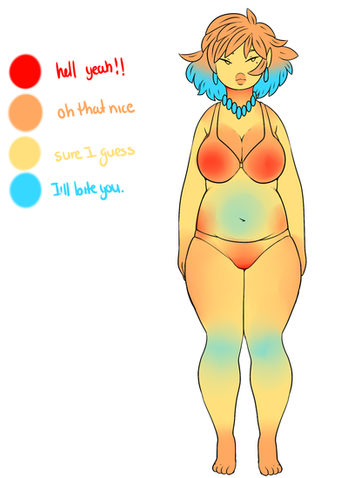 Jakiel: He doesn't mind you a tummy tickle but sides are a no no. Only one gal can do so UuU. He like neck nips, shoulder rubs, and (by Maria only) butt grabs UuU.