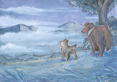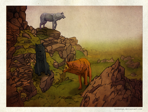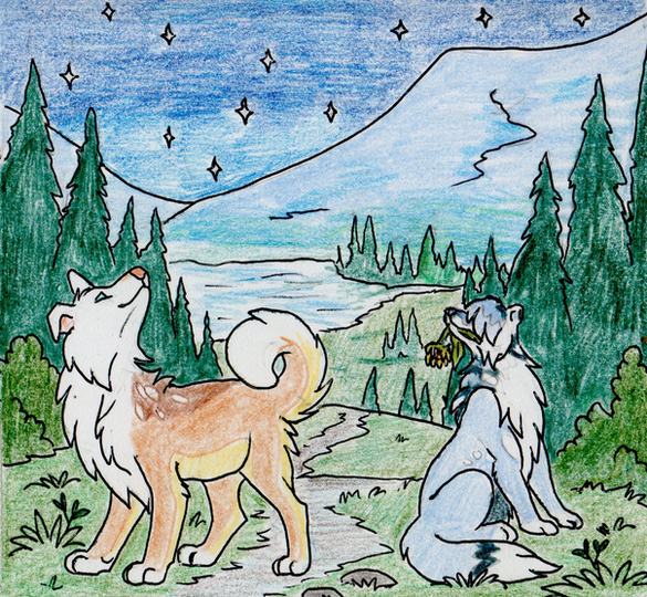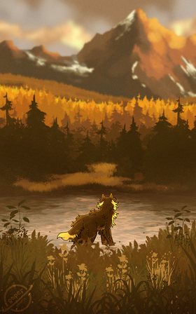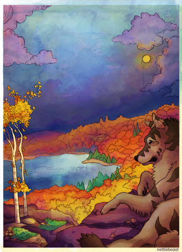 Wow! There are so many aspects of this picture that make it beautiful-- especially the colors of the sky! I also love the trees, the rocks and the way they jut out of the water, the wolf, and that adorable little crab. Wonderful work, once again! ♥ You never cease to amaze me with your artwork!