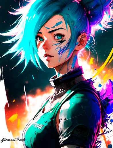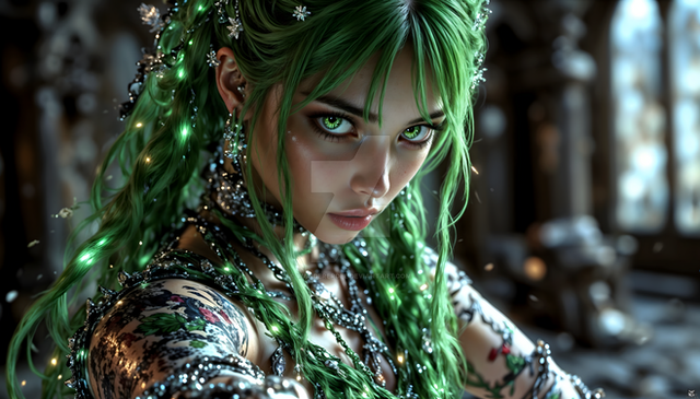 The model in this image has blue hair and is covered in tattoos in various parts of her body. Her skin tone is light and in the image she can be seen posing in an elegant and provocative manner. The context or location of the image is not specified. It is mentioned that the image was designed using artificial intelligence and then edited in Photoshop.If you want to donate here is my PayPal: paypal.me/Giopaol?country.x=CO… Everything donated will be to help abandoned animals with their medical treatments.