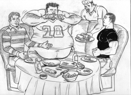 And naturally the superchub is at the top of the table in his rightful place. Wonder what that waiter's thinking of doing with his "hot sausage"?