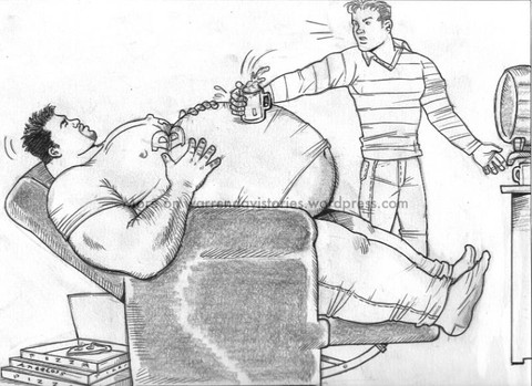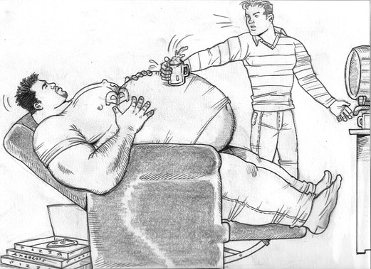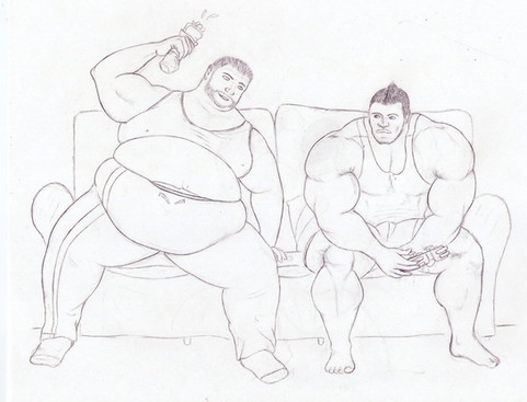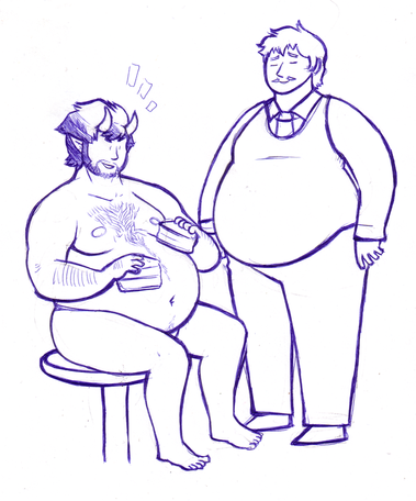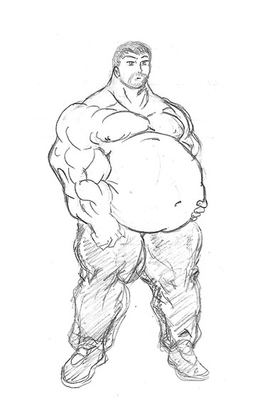 I love the muscle man's huge arms and how they're only have the size of big man. I think he needs more belly and back fat hanging over the side, but love the look on muscle mans face too. He gets to wash his big hunk....Hope he can hold his breath wiping under all the bulk.